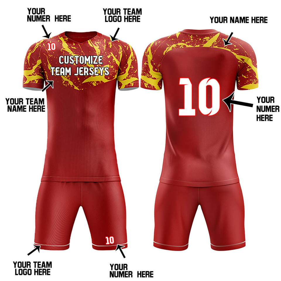 ชุดเสื้อฟุตบอลผ้าโพลีเอสเตอร์ชุดเสื้อเจอร์ซี่สำหรับทีมฟุตบอลสีดำและสีแดงชุดทีมฟุตบอลออกแบบได้ตามต้องการ100%
