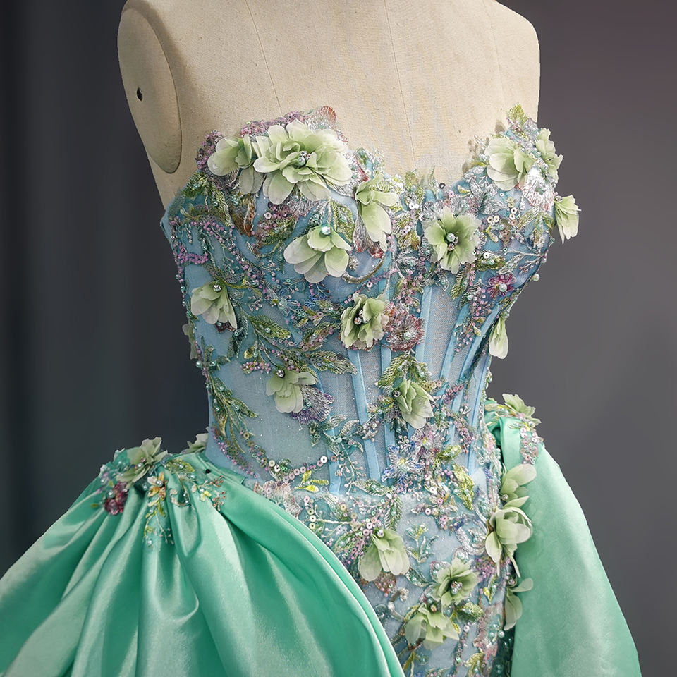 ชุดราตรีทรงเมอร์เมดสีเขียวประดับลูกปัดและเลื่อม พร้อมเชือกผูกเอว สำหรับสาวๆ ไซส์พลัส รุ่น 1216 Chapel Train Modern Plus Size Embroidery Bling Lace-up Pearls