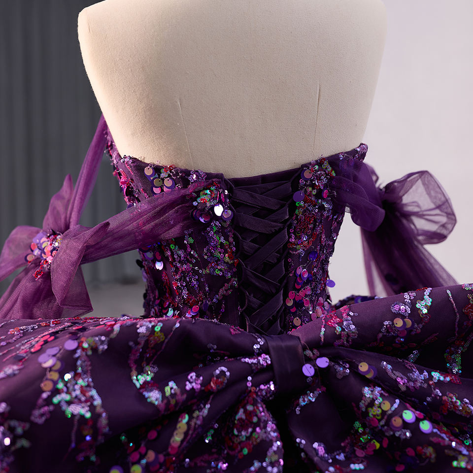 ชุดราตรีงาน Quinceanera สำหรับเด็กผู้หญิง รุ่น 241037 ประดับเลื่อมหรูหรา สีม่วง แต่งโบว์และระบาย