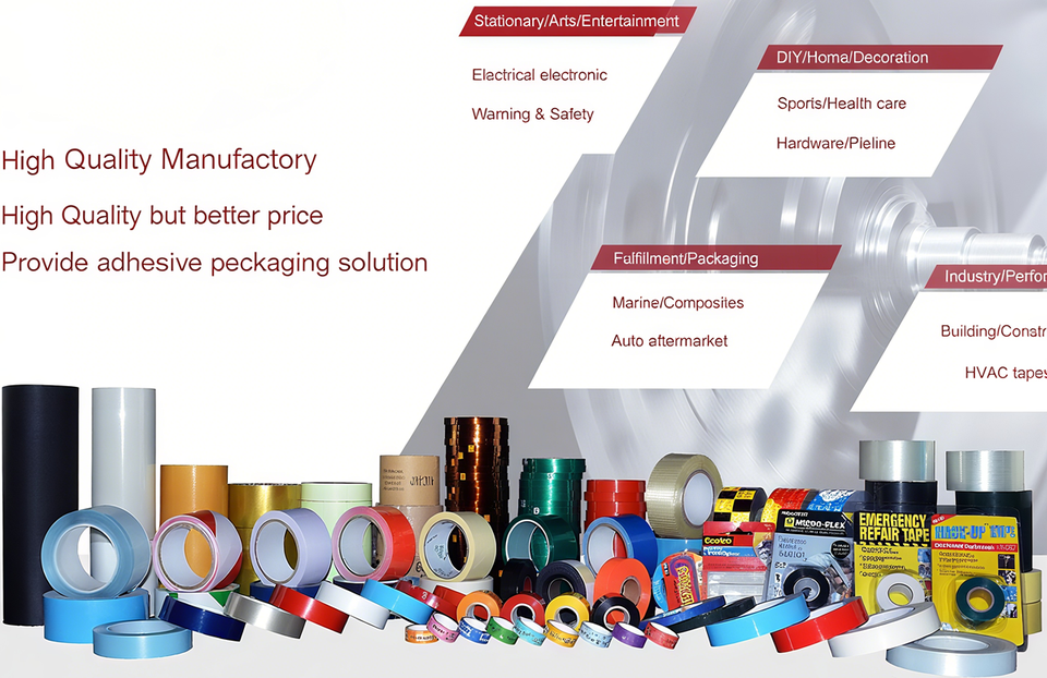 สติกเกอร์กาว, ไดคัท, เสริมความแข็งแรง, เสียงรบกวนต่ำ, นุ่ม, แผ่นเมมเบรนกันน้ำ, เทปกาวปิดกล่อง, กาวทางการแพทย์, เทปพันสายไฟ, ฉีกขาดง่าย, เทปกระดาษ, กระดาษสติกเกอร์, เทปทนความร้อนสูง, เทปวาชิตกแต่ง, กาวไวต่อแรงกด, เทป BOPP, กระดาษสติ๊กเกอร์กาว, เทปโลหะนำไฟฟ้า, เทปผ้าใยแก้ว, ฟิล์มหด PVC, เทปกาวหน้าเดียว, เทปฟอยล์อลูมิเนียม, เทปพันสายไฟ PVC, เทปวาชิญี่ปุ่น