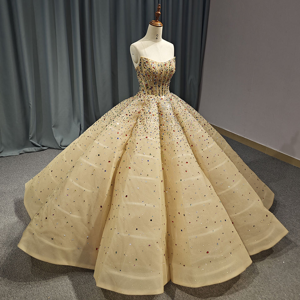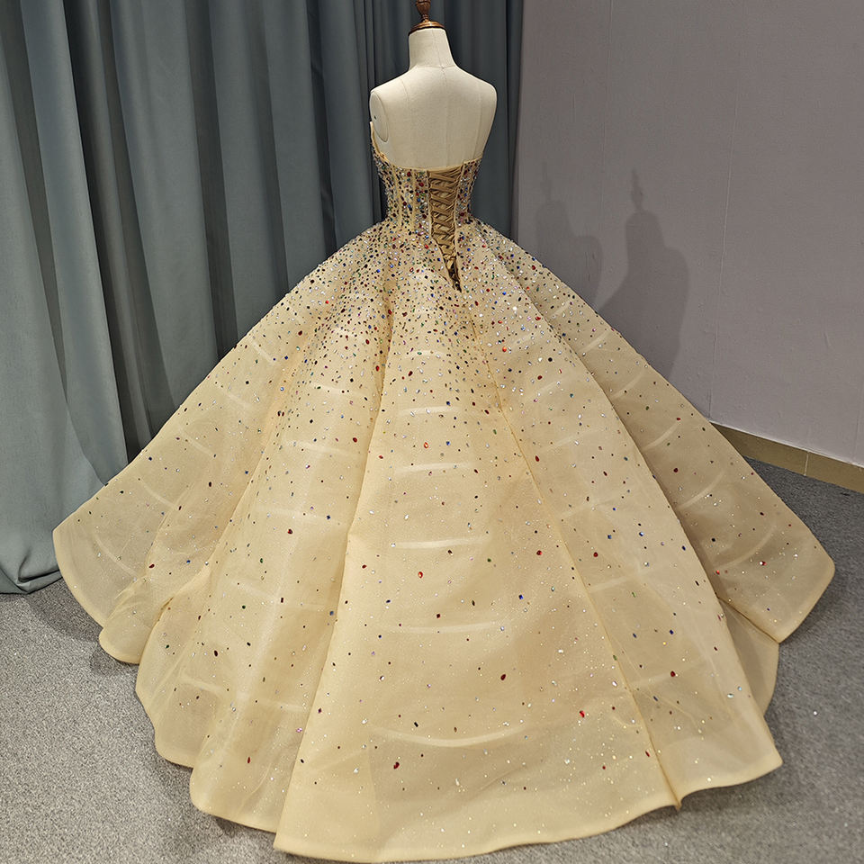 ชุดราตรีทรงบอลกาวน์แขนกุดปักคริสตัล 6606 แบบมีระบายช่วงเอวสีธรรมชาติ โทนสีลูกกวาด