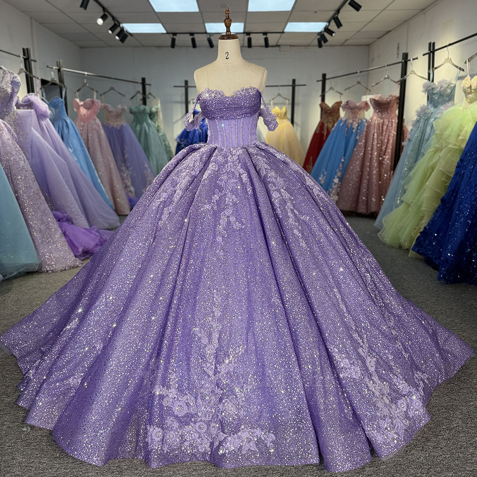 ชุดเดรสงาน Quinceanera แบบ Ball Gown ประดับด้วยลูกปัดมุกสีม่วงกลิตเตอร์ 6848 เม็ด พร้อมคริสตัลและงานปักลายธรรมชาติ