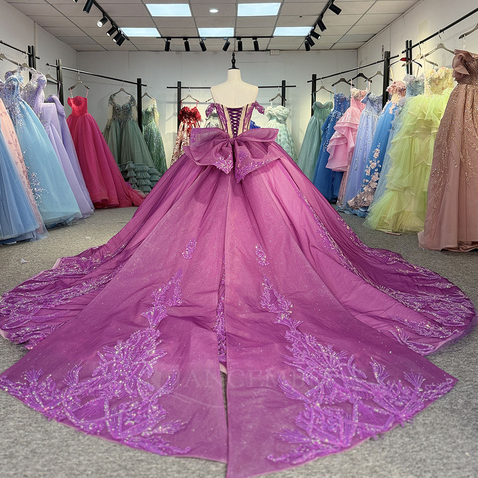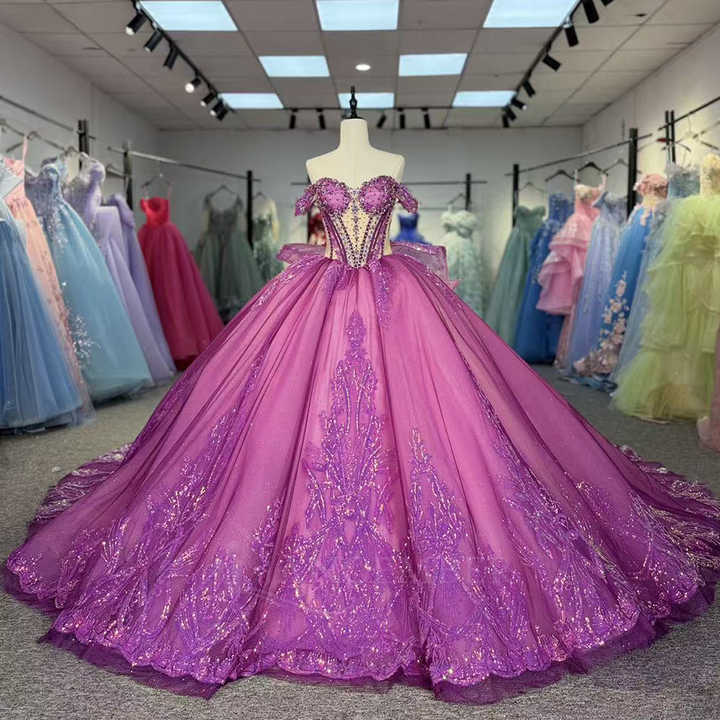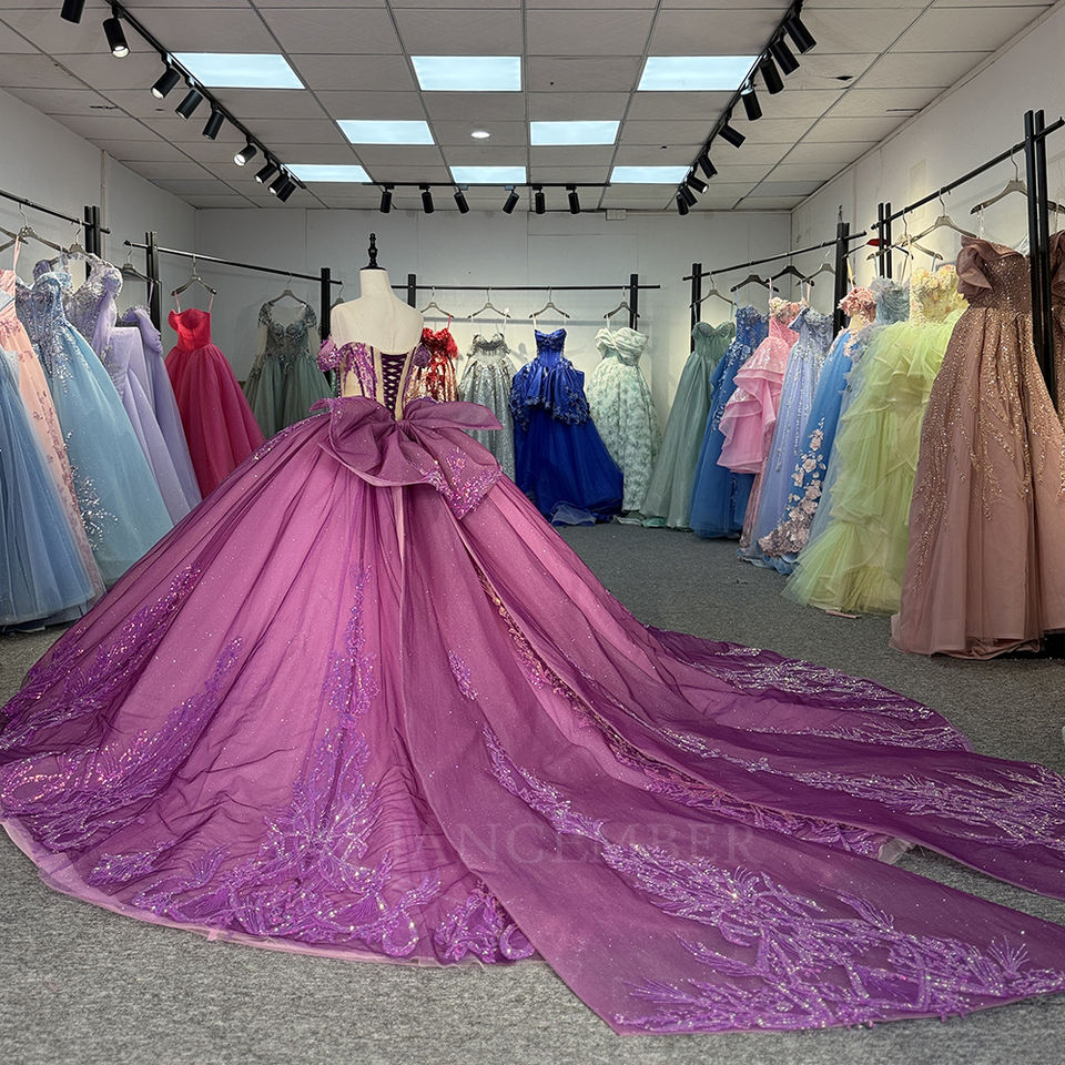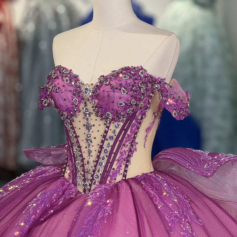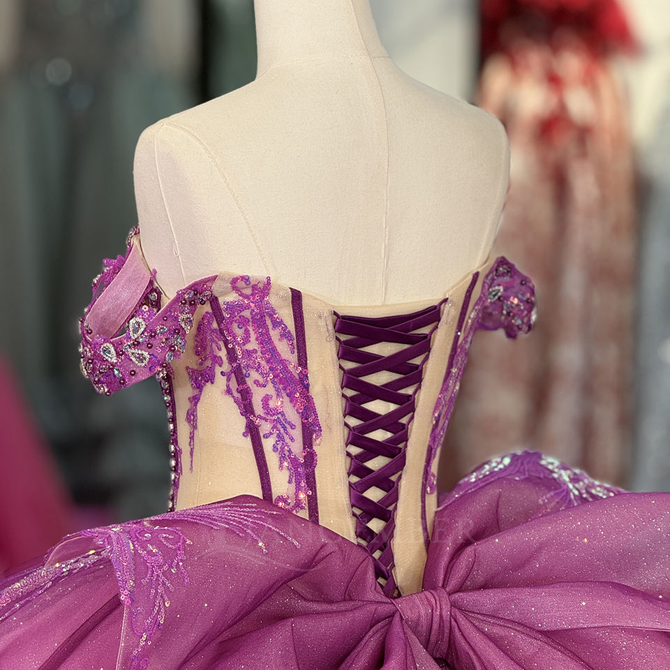 ชุดเดรสออกงานสีม่วงรุ่น 6891 ประดับเลื่อมลายฉลุหวานซึ้ง ตกแต่งคริสตัล ป้องกันไฟฟ้าสถิตย์ พิมพ์ลายธรรมชาติ สำหรับงาน Quinceanera ของผู้หญิง
