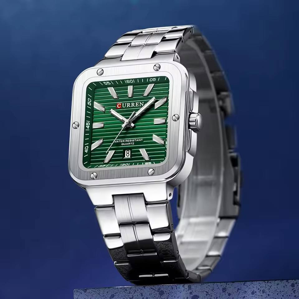 นาฬิกาควอตซ์ผู้ชาย รุ่น 8479 ตัวเรือนสแตนเลสสตีล หน้าปัดสี่เหลี่ยม กันน้ำ 3BAR แฟชั่นสปอร์ต ธุรกิจ พร้อมปฏิทิน เข็มเรืองแสง