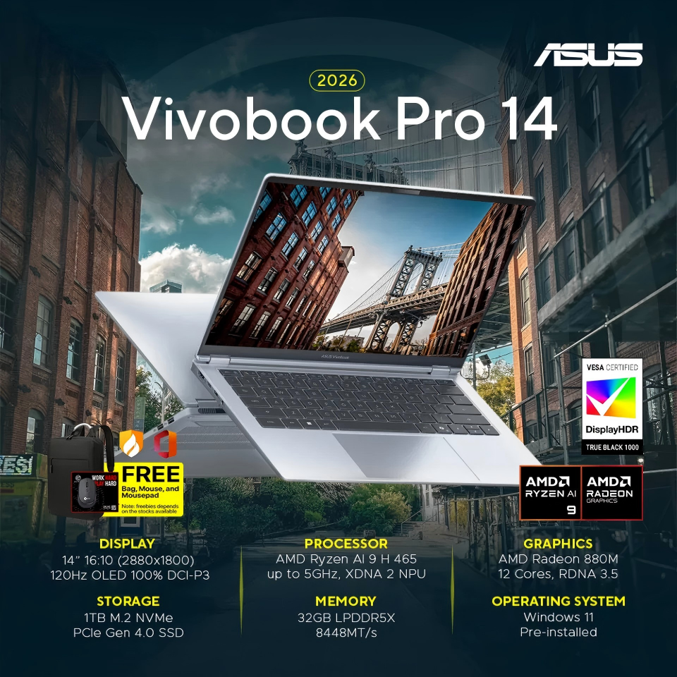 สำหรับ A-SUS Vivobook Pro 14 2026 AMD Ryzen AI 9 H 465 Radeon 880M หน้าจอ 14 นิ้ว 2.8K OLED ความละเอียด 2880x1800 120Hz ความสว่าง 1100nits แรม 32GB DDR5 SSD 1TB