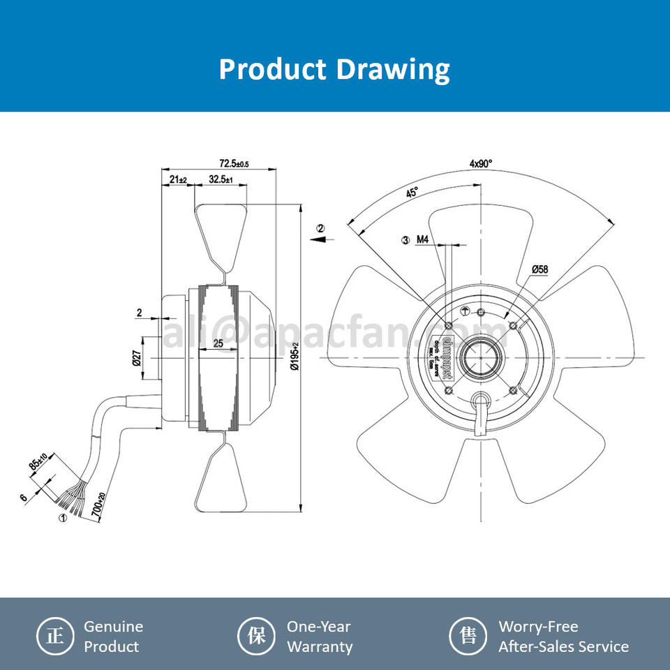 พัดลมระบายความร้อนแบบแกนสำหรับอินเวอร์เตอร์ Lenze รุ่น A2D200-AA02-33 230/400VAC 2800RPM 53W 7 สายไฟ พร้อมขั้วต่อแบบ Splice Terminals ของแท้จากโรงงาน (OEM)