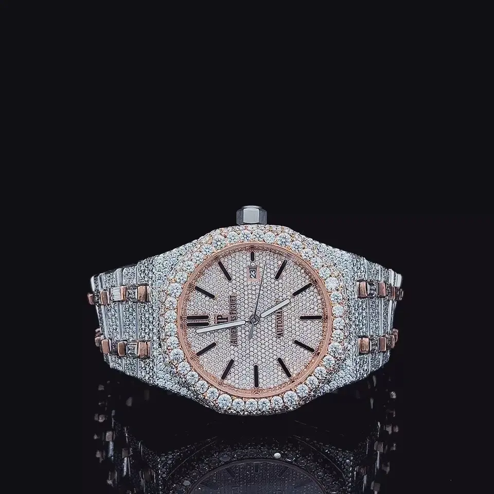 นาฬิกาข้อมือผู้ชายหรูหรา ประดับเพชรโมอิสซาไนต์ ตัวเรือนสี่เหลี่ยมสองสีโรสโกลด์ สายสแตนเลส ระบบควอตซ์ ตัวล็อคแบบผีเสื้อ