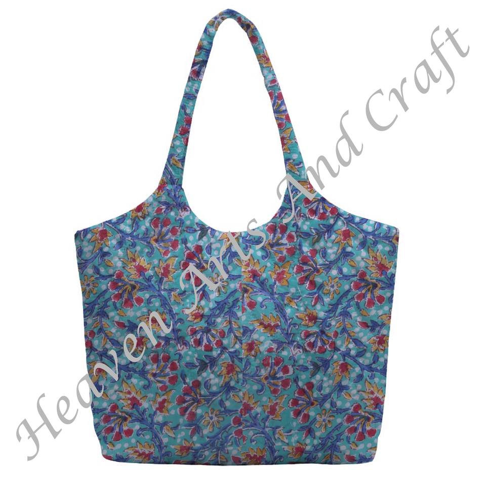 กระเป๋าผ้าทรงสี่เหลี่ยมมีหูจับ2ข้างผ้าคอตตอนทรงหลวมพิมพ์ลายบล็อคด้วยมือใช้ซ้ำได้สำหรับชายหาด