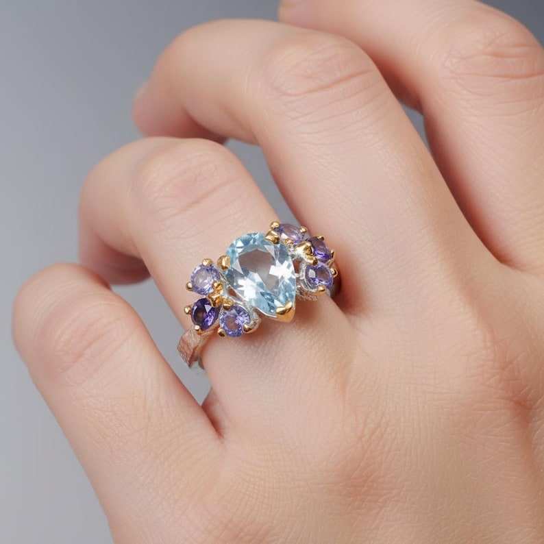 แหวนแต่งงานหรูหราบลูโทแพซ รับรองโดย IGI เงินแท้ 925 ประดับเพชรแบบหนามเตย เครื่องประดับสุดหรูสำหรับคนมีรสนิยม