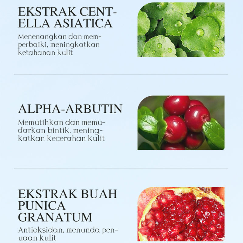ส่วนผสม:อินทรีย์, ใบบัวบก, อัลฟ่าอาร์บูติน, พูนิกา แกรนาทัม, โซเดียม ไฮยาลูโรเนต, ไนอะซินาไมด์