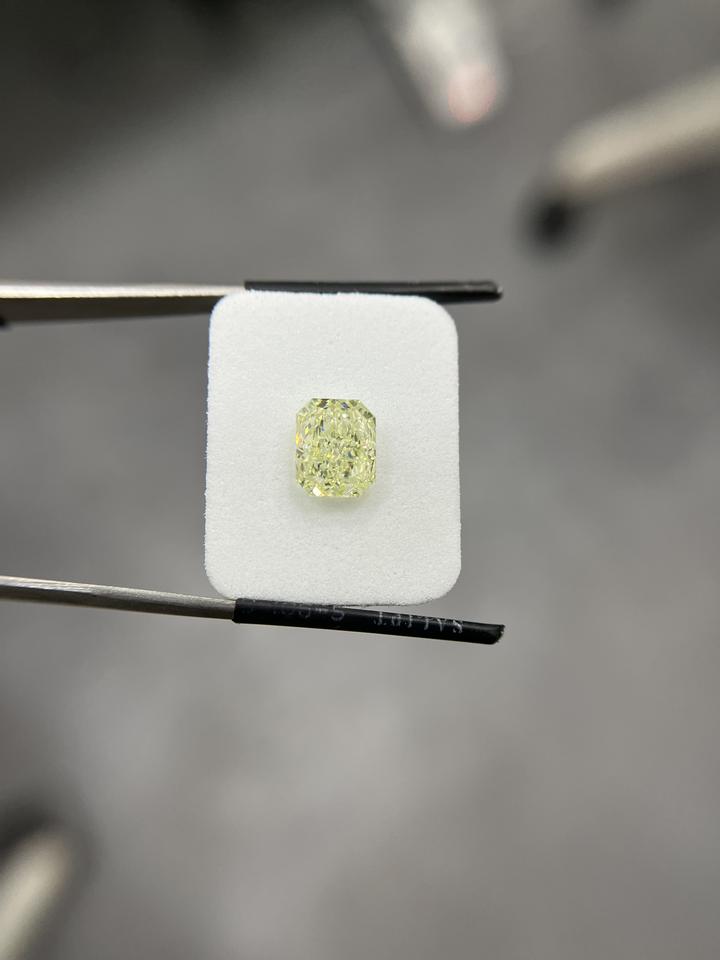 เพชรแท้ธรรมชาติสีเขียวอมเหลืองทรงเหลี่ยมเจียระไนแบบเรเดียนท์ น้ำหนัก 2.15 กะรัต ขัดเงา EX สมมาตรภาพ VG