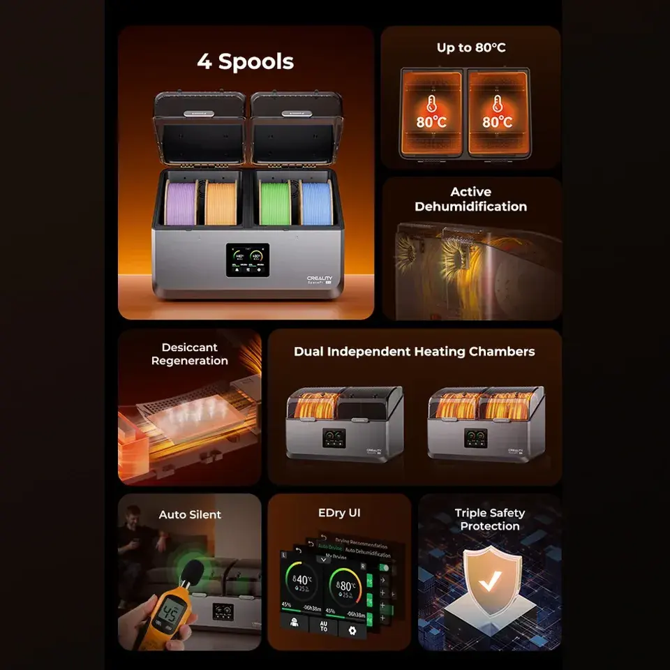 เครื่องพิมพ์สามมิติ Creality Original SpacePi X4 ออลอินวัน 80c ห้องทำความร้อนคู่แบบอิสระ พร้อมระบบอบแห้งอัตโนมัติแบบเงียบ 4 แกนม้วน ใหม่