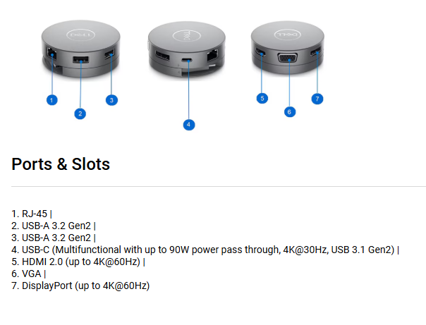 อะแดปเตอร์มือถือสำหรับ Dell DA310 USB-C 4K พร้อม HDMI, DisplayPort, Ethernet, VGA, USB-A และ USB-C พอร์ตสำหรับ Dell