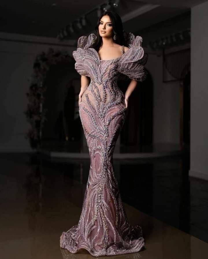 ชุดราตรีทรงเมอร์เมดประดับคริสตัลสีน้ำเงินกรมท่า แขนสั้น แต่งเลื่อมเก๋ไก๋ สำหรับดรอปชิปปี 2025