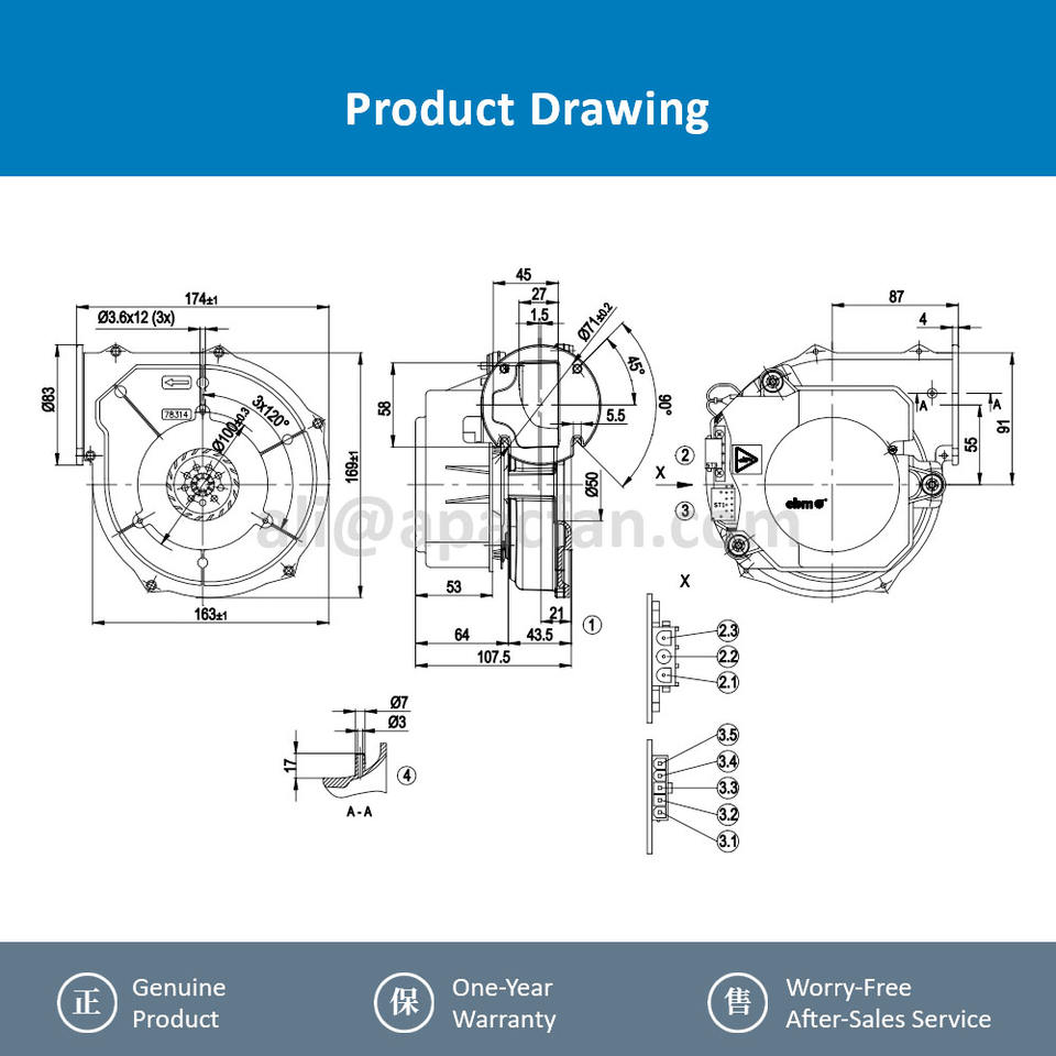 พัดลมระบายความร้อนแบบแรงเหวี่ยง EC รุ่น G1G126-AA49-71 230VAC 5000RPM 75W 130m3/h สำหรับงานพิมพ์ พร้อมลูกปืนแบบ OEM วัสดุพลาสติกเสริมแรง PA6