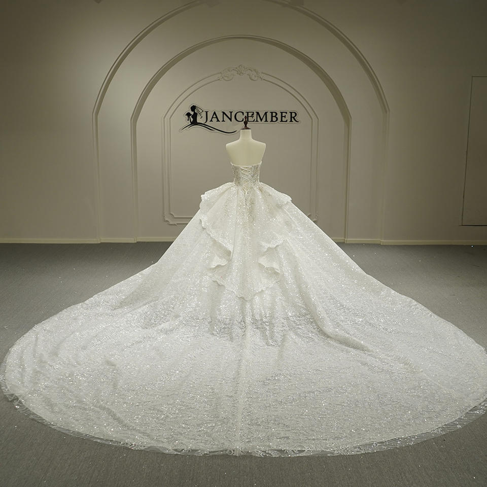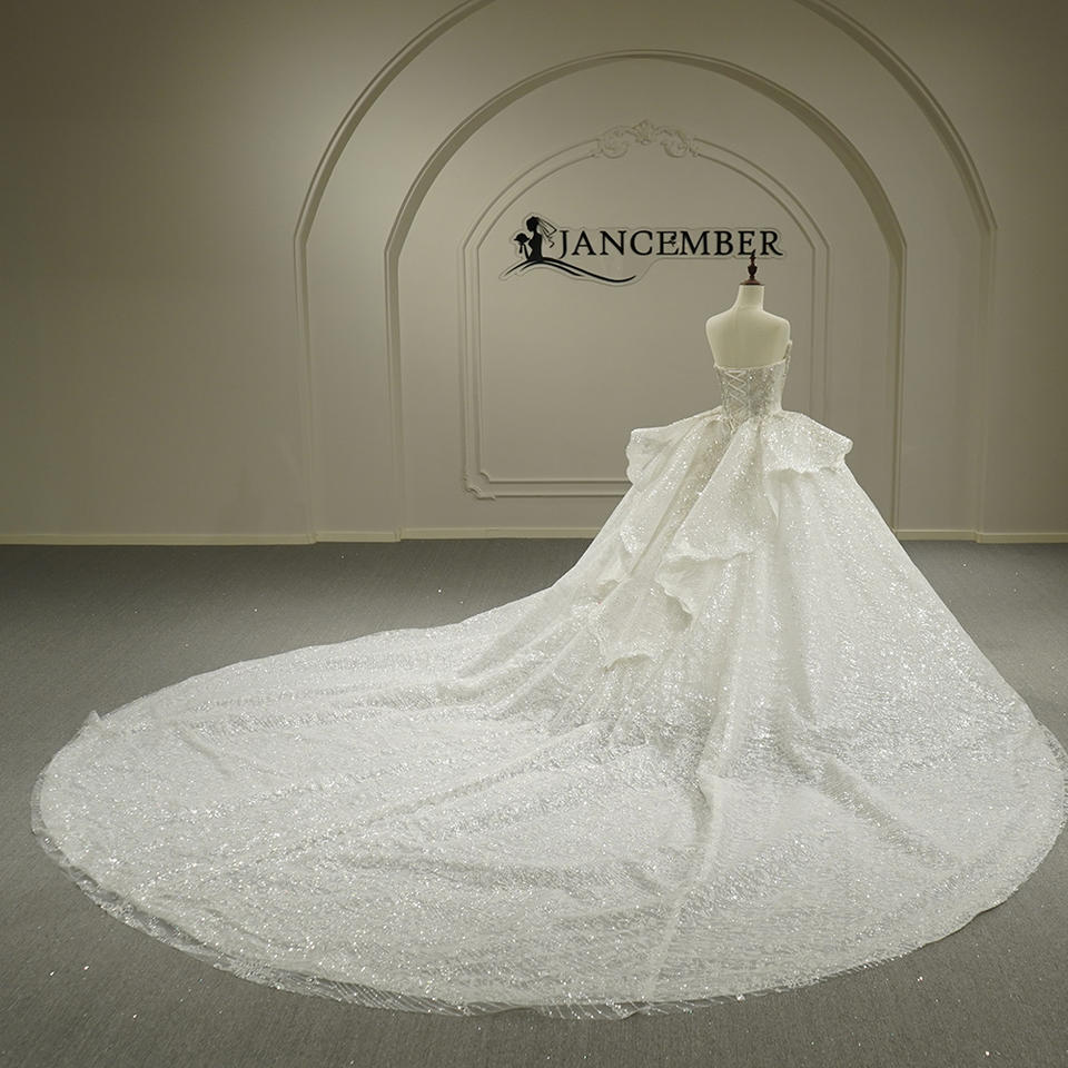 ชุดแต่งงานทรงบอลกาวน์แบบไร้สายรัดไหล่ รุ่น GT26039 ดีไซน์ทันสมัย พร้อมชายกระโปรงยาวแบบชาเปลและประดับด้วยดอกไม้