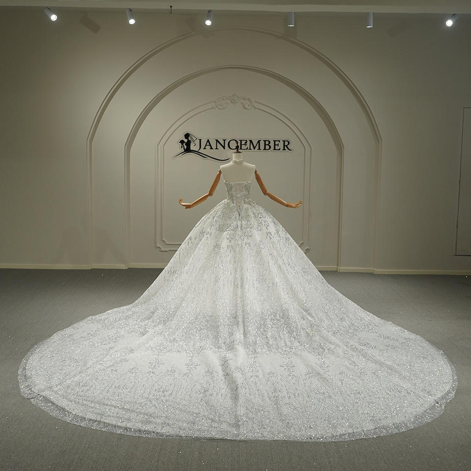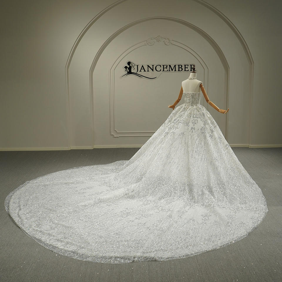 ชุดแต่งงานทรงโบ๊ทเนคประดับเลื่อมลูกปัดแบบพองฟู รุ่น GT26061 พร้อมชายกระโปรงยาวแบบชาเปลและลูกไม้ลายดอกไม้