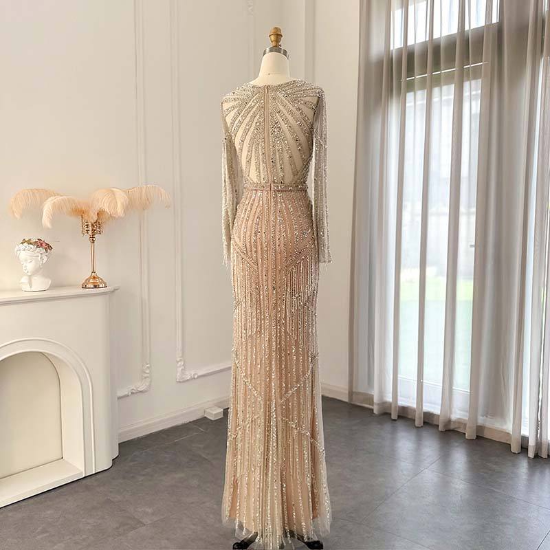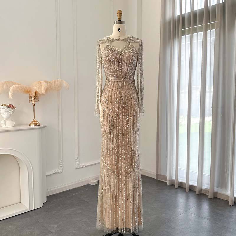 For LSCZ07 Vintage Muslim Mermaid Evening Dresses Silver Nude Long Sleeve Tassel Tulle Sequined Beading Empire Formal
