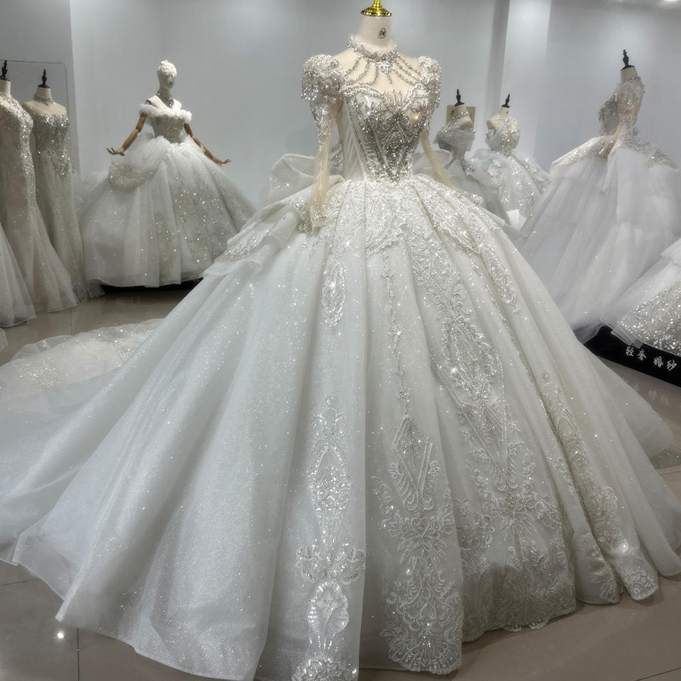 ชุดแต่งงานแขนกุดประดับไข่มุกหรูหราปรับแต่งตามอารมณ์