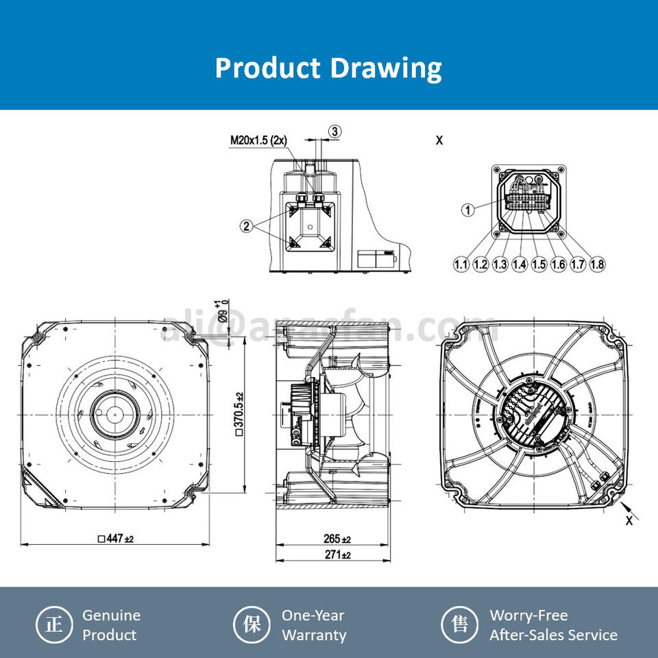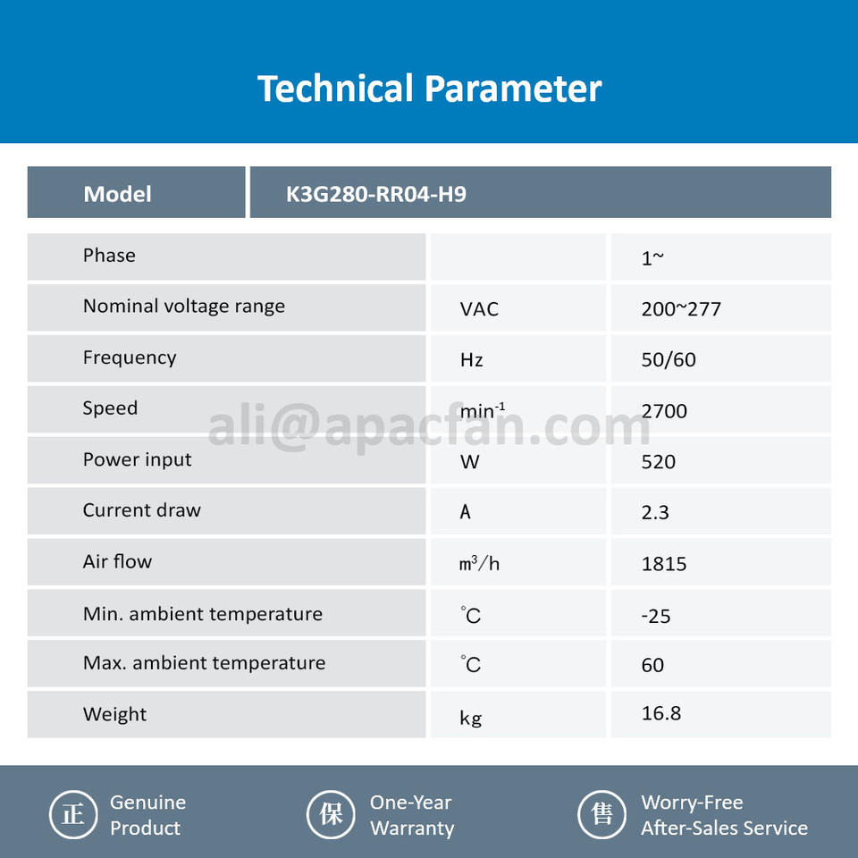 K3G280-RR04-H9 280 มม. 230V AC 520W 2.3A 2700RPM IP55 แบริ่งบอลสำหรับซีเมนส์ อีซีพัดลมระบายความร้อนแบบแรงเหวี่ยงโลหะ