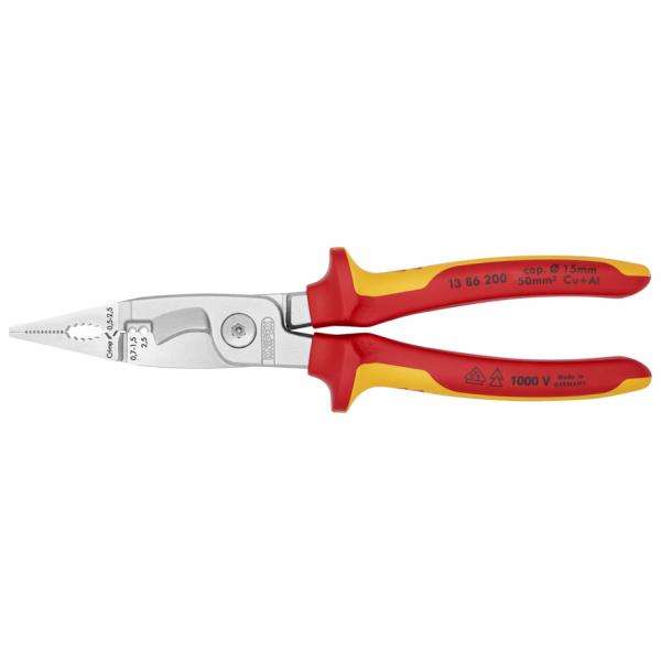 คีมติดตั้งระบบไฟฟ้าของ Knipex ชุบโครเมียม พร้อมด้ามจับหุ้มฉนวนหลายชั้นผ่านการทดสอบ VDE