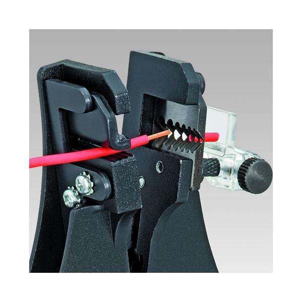 คีมปอกฉนวนของ Knipex พร้อมด้ามจับเคลือบสีดำและด้ามจับพลาสติก ใบมีดแบบปรับได้