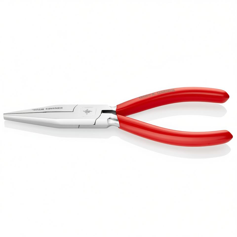 คีมปากยาวของ Knipex พร้อมด้ามจับชุบโครเมียม ปากคีมรูปสี่เหลี่ยมคางหมูเคลือบพลาสติก พื้นผิวจับแบบมีร่อง