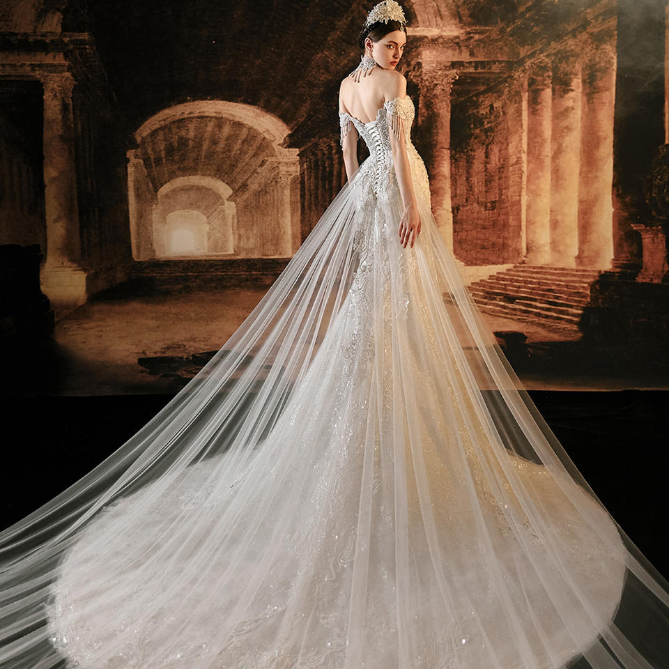 ชุดแต่งงานทรงเมอร์เมดแบบคอร์เซ็ทเปิดหลังประดับพู่ห้อย รุ่น LSMX011 ตกแต่งด้วยคริสตัลลายดอกไม้ พร้อมชายกระโปรงยาวลากพื้นสำหรับผู้หญิง