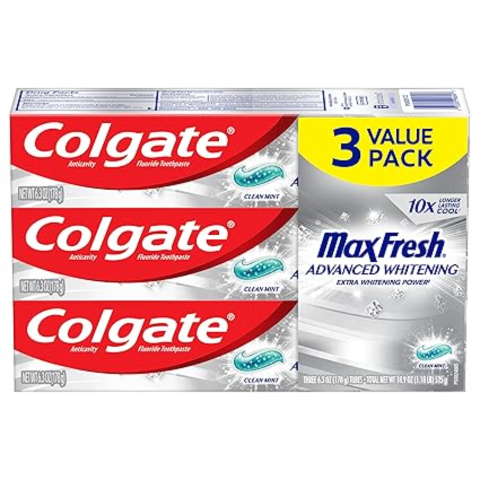 ยาสีฟันแม็กซ์เฟรช แอดวานซ์ ไวท์เทนนิ่ง 6.3 ออนซ์ สารสกัดจากพืช แบบหลอด 3 หลอด-กลิ่นมิ้นท์สดชื่น สำหรับกลิ่นปาก ฟันบอบบาง เหมาะสำหรับการเดินทาง