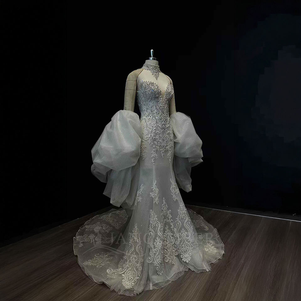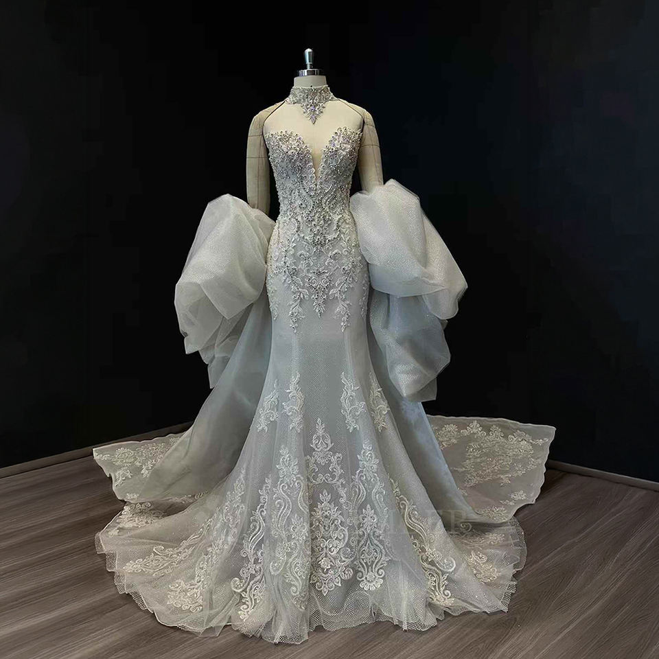 ชุดแต่งงานทรงเมอร์เมดหรูหราทันสมัย NT01 ประดับลูกปัดหนัก ดีไซน์คอวี พร้อมกระโปรงคลุมประดับดอกไม้คริสตัลและชายกระโปรงยาวแบบชาเปลเทรน