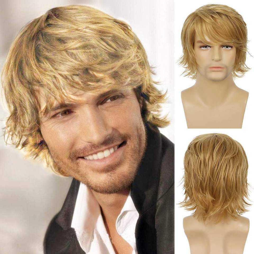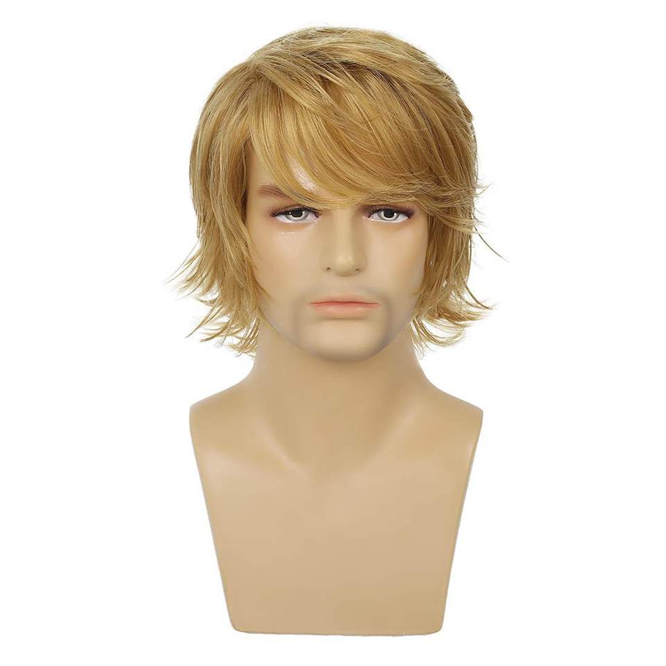วิกผมใหม่สไตล์ยุโรปอเมริกันสำหรับผู้ชาย ทรงผมหน้าม้าเฉียงสีทอง ผมหยิกสั้นเป็นลอน ใยสังเคราะห์ รุ่น M1058 ผลิตด้วยเครื่องจักร