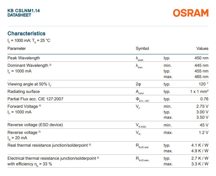 ชิป LED สีน้ำเงิน 459nm กำลังสูง 3W รุ่น OSTAR KB CSLNM1.14 สำหรับจอแสดงผลเชิงพาณิชย์/อุตสาหกรรม/ค้าปลีก