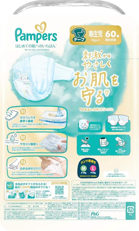 สำหรับปรนเปรอเทปผิวแรก NB60 (nb-5kg) | ผ้าอ้อมญี่ปุ่นระดับพรีเมี่ยม | ดูดซับ14ชั่วโมงนุ่มพิเศษ | ผ้าอ้อมเด็กแบบใช้แล้วทิ้ง