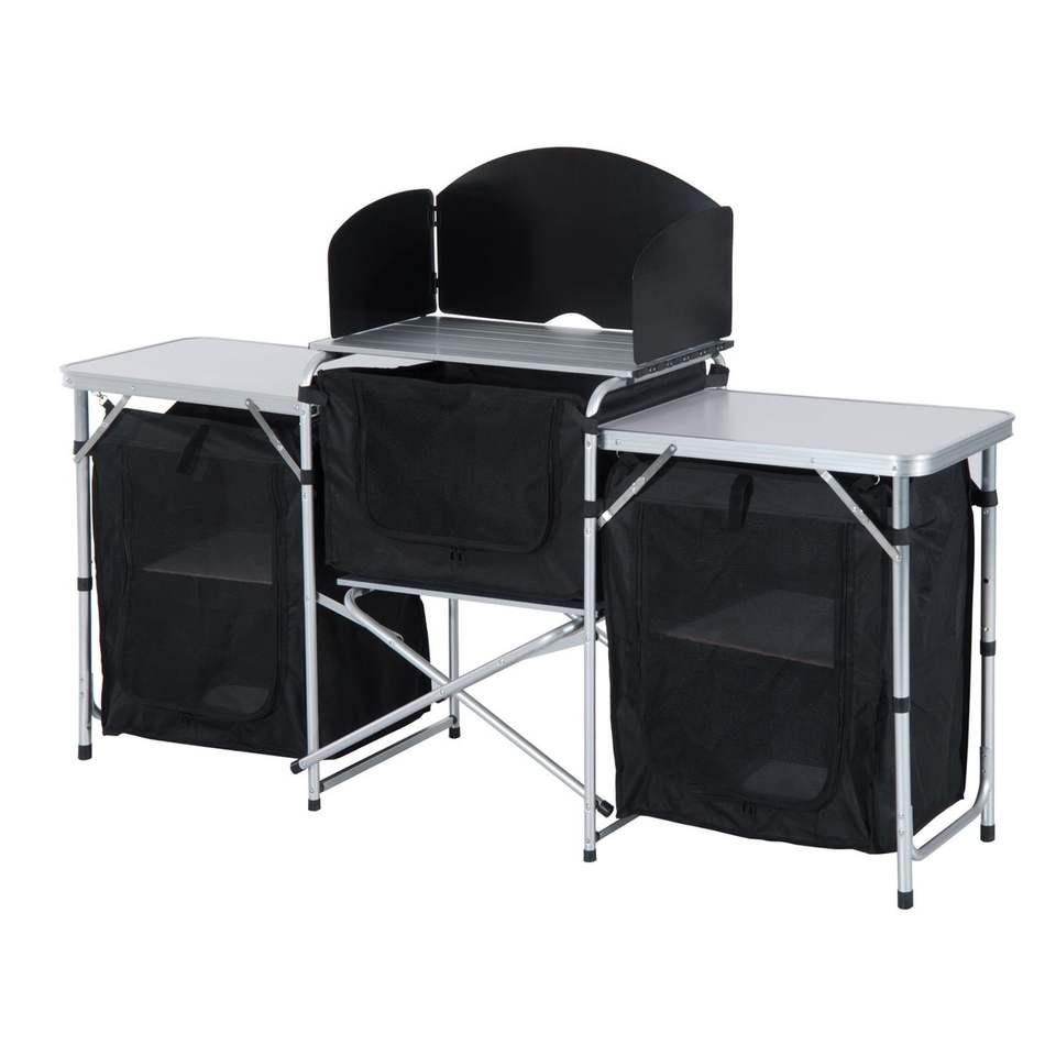 For Portable Camping Aluminum Table Fold-Up Cooking Kitchen Windscreen 3 Enclosed Cupboards for BBQ Party Picnics