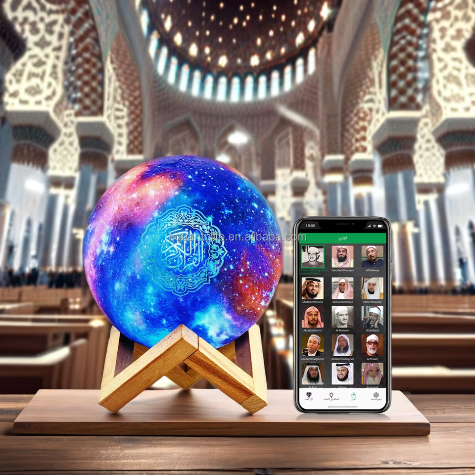 ลำโพงอัลกุรอาน QB512 ของขวัญสำหรับชาวมุสลิม ควบคุมผ่านแอพฯ เล่น MP3 พร้อมโคมไฟรูปพระจันทร์แบบสัมผัส เครื่องเล่นอัลกุรอานพกพา วัสดุพลาสติก รองรับ 15 นักอ่าน 17 เสียง