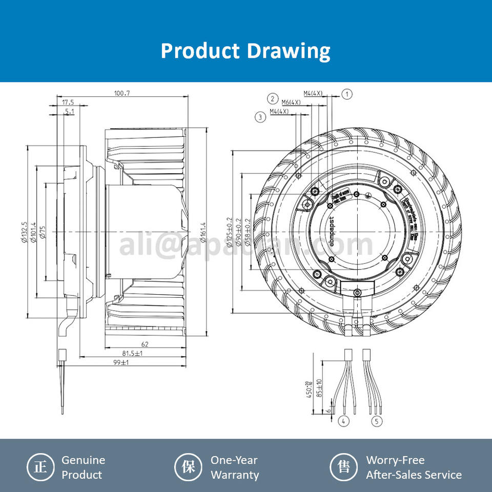 สำหรับ R3G160-8317076570 R3G160-AU09-01 220VAC PWM 2100รอบต่อนาที632m 3/ชั่วโมง170W 1.7A สแตนเลสมอเตอร์ EC ระบบลมบริสุทธิ์