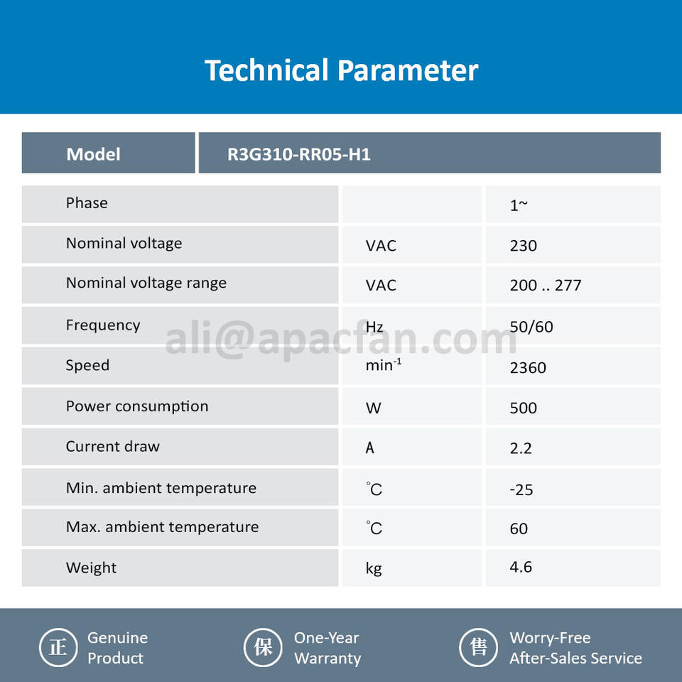 เครื่องทำอากาศให้บริสุทธิ์แบบ3680m 3/H ODM อิสระสำหรับ R3G310-RR05-H1 M3G084-DF ขนาด250มม. 230VAC 50/60HZ 500W 2.2A 2360รอบต่อนาที