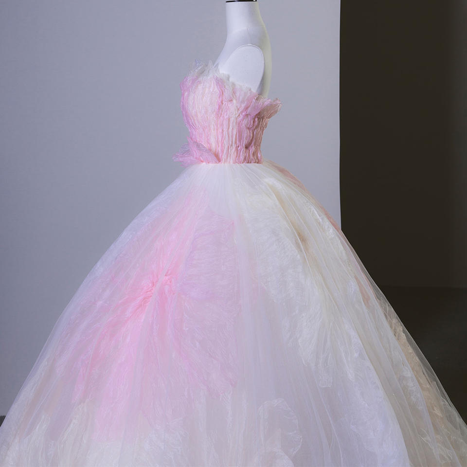 ชุดราตรีงาน Quinceanera รุ่น SFY05 สีชมพูพาสเทล แบบไร้สาย ประดับคริสตัล ปักลายดอกไม้ ทรงบอลกาวน์แบบยาว