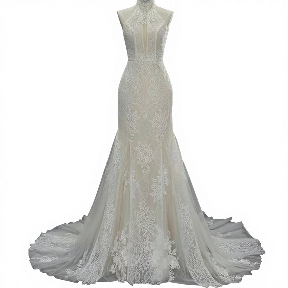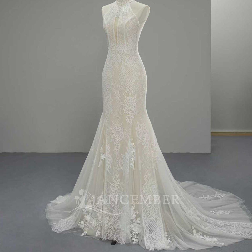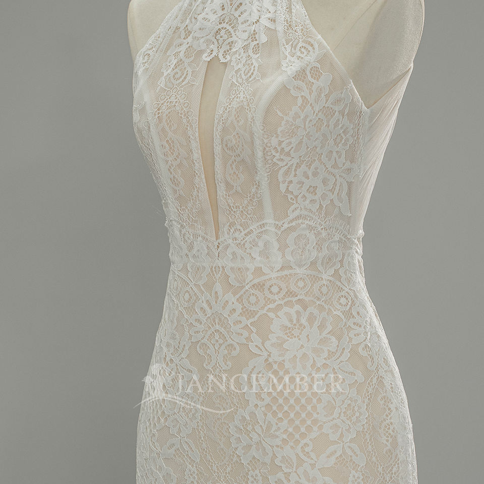 ชุดแต่งงานทรงเมอร์เมด SFY334 สไตล์โบฮีเมียนสมัยใหม่ คอแบบผูกเชือก แต่งลูกไม้ปักลายดอกไม้ประดับคริสตัล