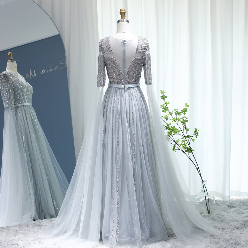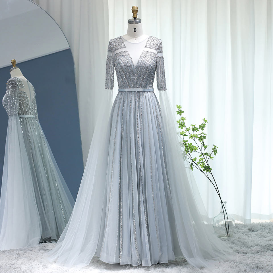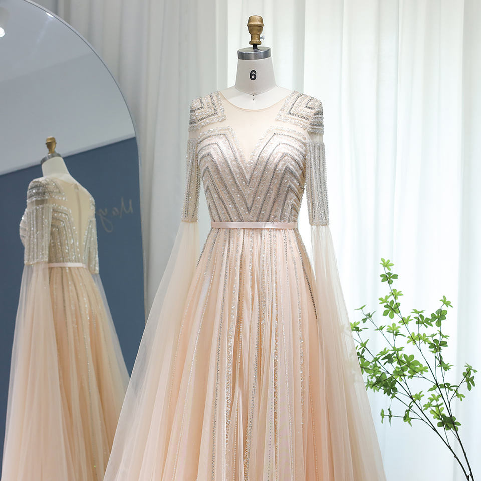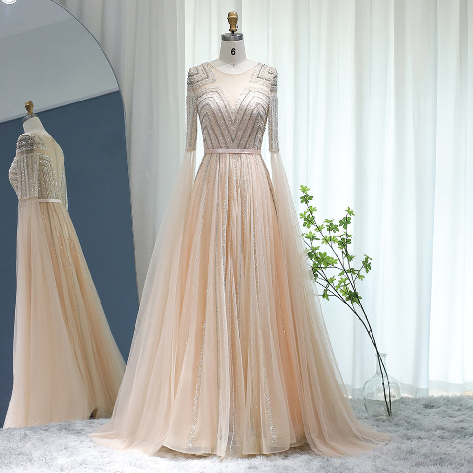 ชุดราตรีผ้าออร์แกนซ่าสีเงินเทาแบบหรูหรา รุ่น SZ068 ประดับคริสตัล 3 มิติ ลายขนนก ยาวกรอมพื้น สไตล์อาหรับ สีแชมเปญ สำหรับชาวมุสลิม