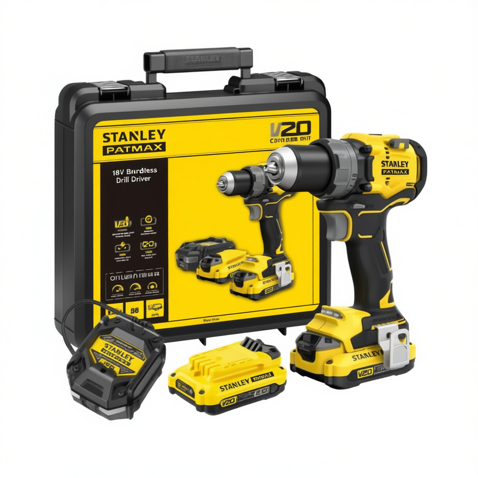 สำหรับสว่านไร้สาย Stanley 18V V20 พร้อมแบตเตอรี่ 2 ก้อน ที่ชาร์จ และกระเป๋าใส่