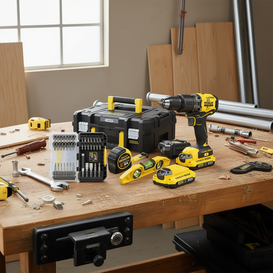 ชุดสว่านโรตารี่ Stanley 20V พร้อมระดับน้ำและดอกสว่าน แบตเตอรี่ 2 ก้อน 2Ah เครื่องชาร์จ และกระเป๋าใส่