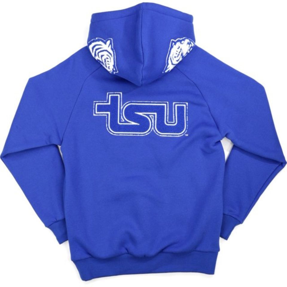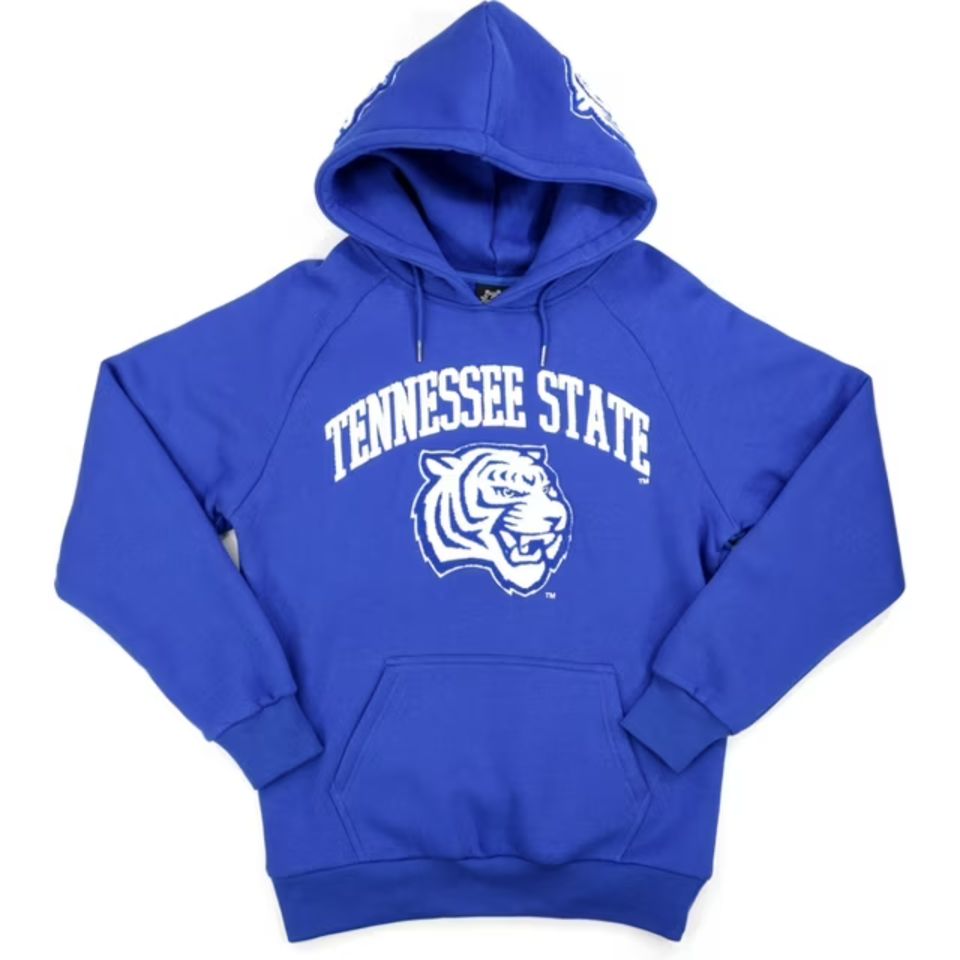 เสื้อฮู้ดมหาวิทยาลัยของรัฐเสื้อผ้าฝ้าย100% ลายเสือโคร่งดีไซน์ด้านหน้าเสือสีฟ้าเสื้อผ้า Hbcu ที่กำหนดเองได้ป้องกันการหดตัว