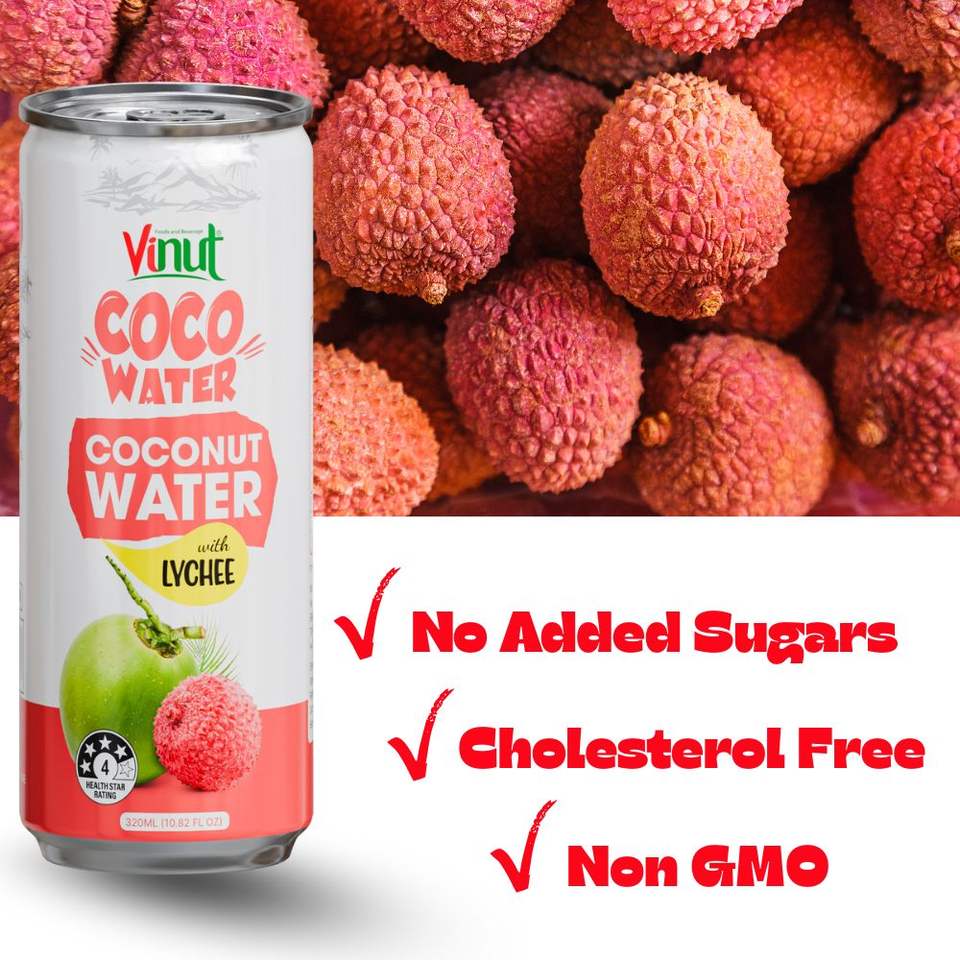 น้ำมะพร้าวไม่มีน้ำตาลผสมลิ้นจี่บด 320 มล. ขายส่ง รับผลิตแบรนด์ส่วนตัว มีตัวอย่างฟรี ผู้ผลิตจากเวียดนาม