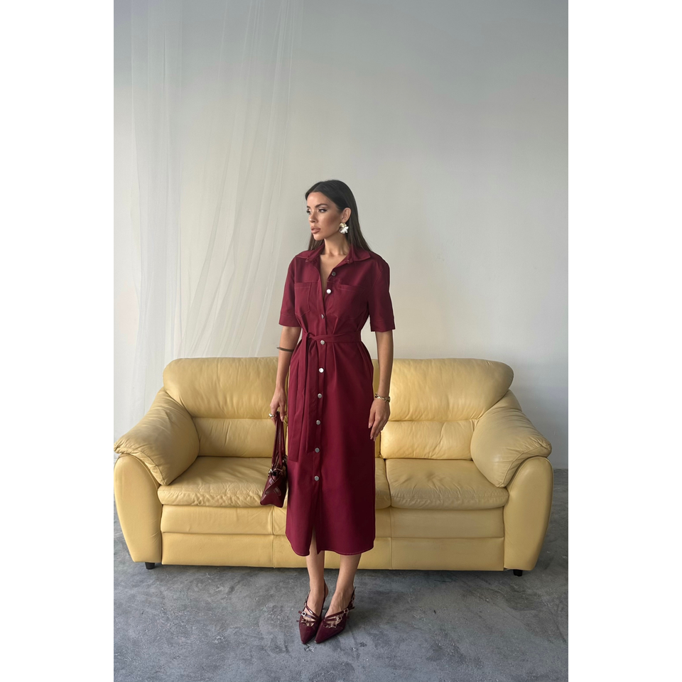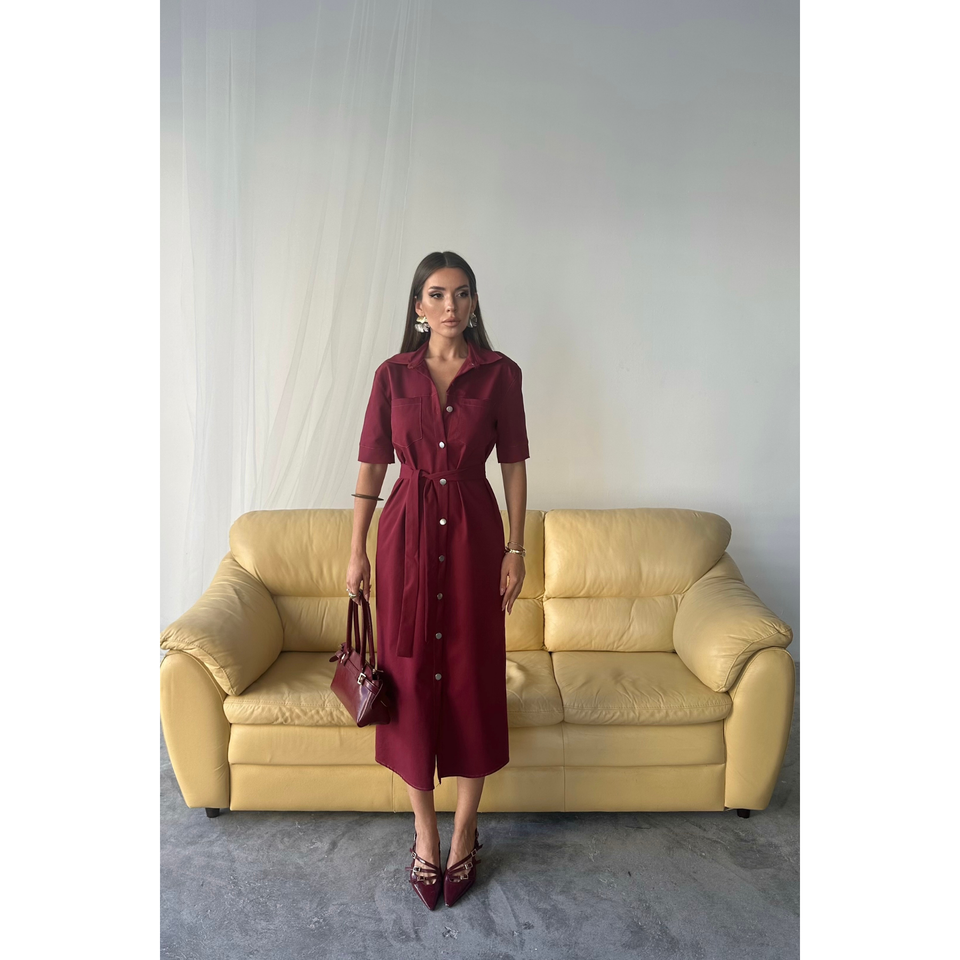 ชุดเดรสแขนสั้นสีเบอร์กันดี TENCEL ติดกระดุมด้านหน้า เหมาะสำหรับใส่ทำงาน