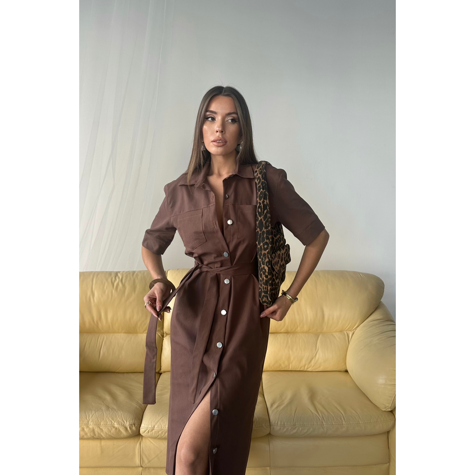 สำหรับเดรสแขนสั้นเทนเซล กระดุมด้านหน้า สีน้ำตาล ความยาวระดับเข่า ไม่มีสายรัด สำหรับสุภาพสตรีออฟฟิศ แฟชั่นสำหรับงานปาร์ตี้ ใส่ได้ทุกวัน ฟรีไซส์