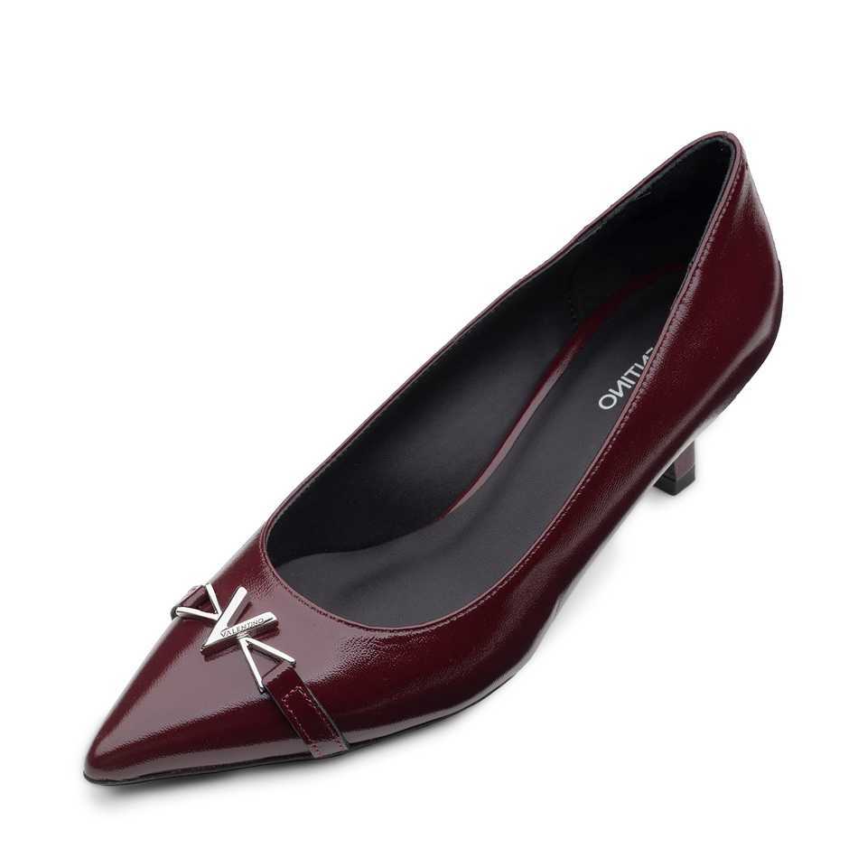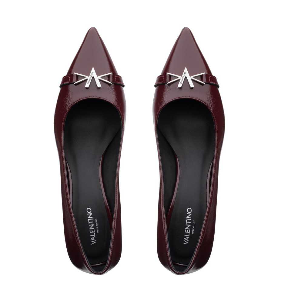 รองเท้าส้นเตี้ยผู้หญิงแบบเปิดส้น สีเบอร์กโดซ์ ทำจากหนังเคลือบเงา ส้นสูง 3 ซม. ผลิตในอิตาลี