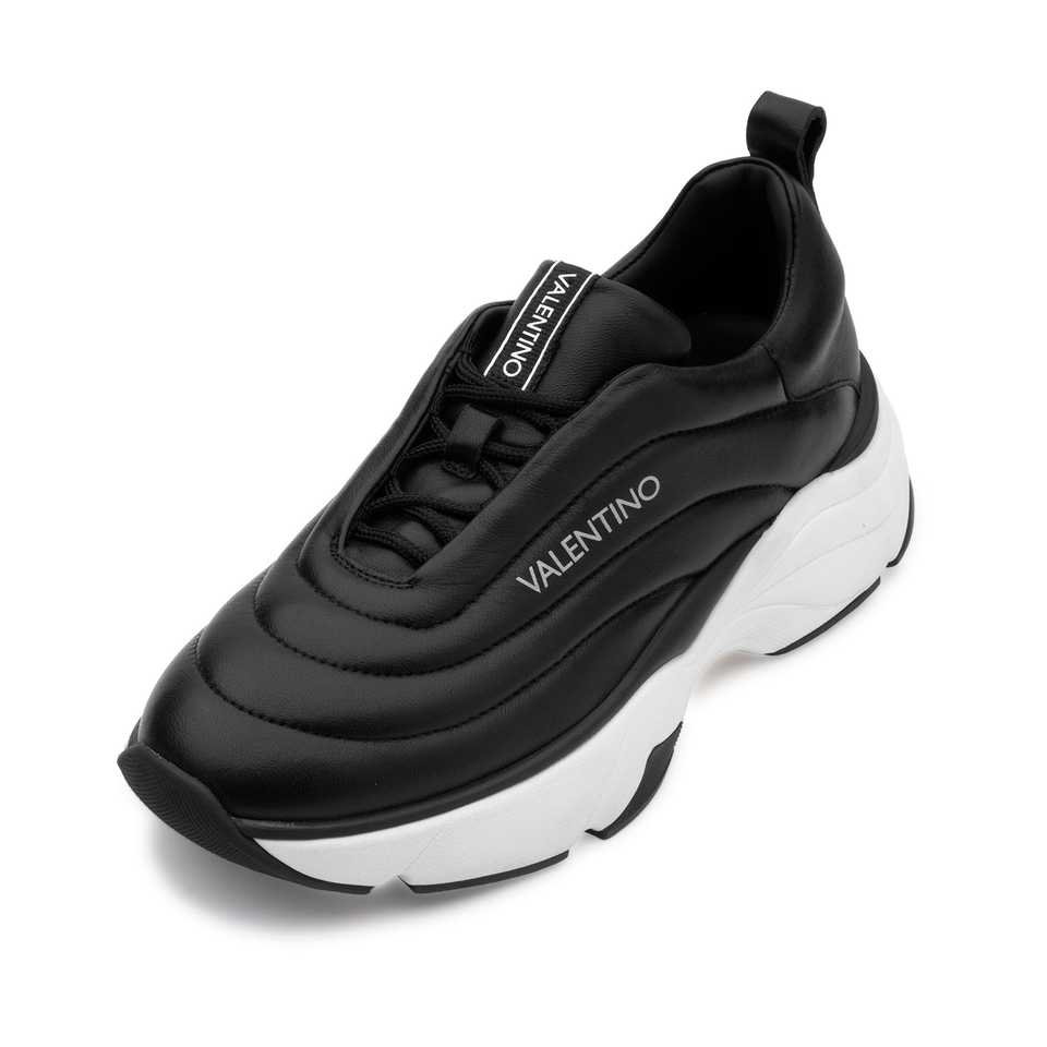 รองเท้าผ้าใบหนังวีแกนสำหรับผู้หญิงสีดำ ยี่ห้อ Loto ผลิตในอิตาลี ปักโลโก้ ดีไซน์ Effetto Imbottito พื้นยางสีขาว ส้นหนา