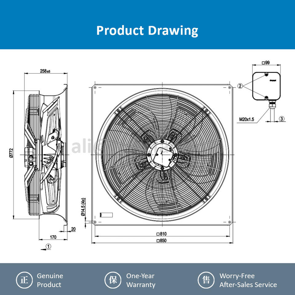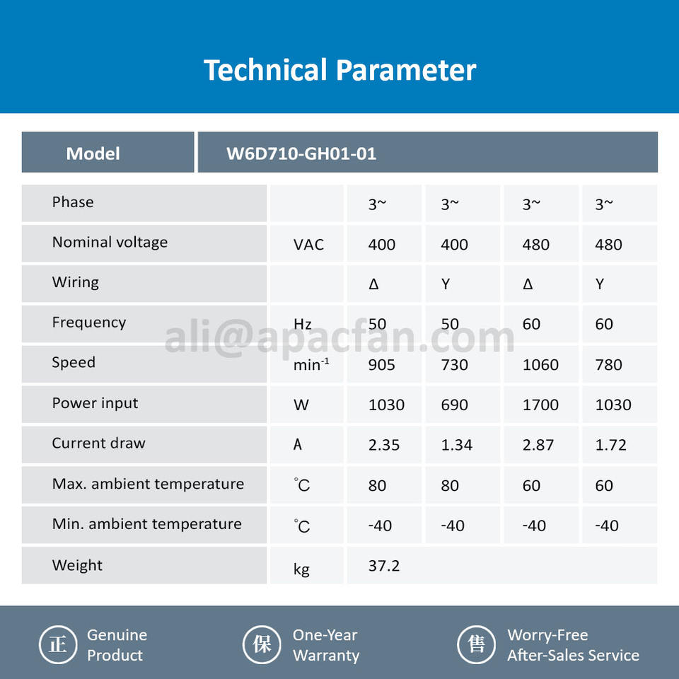 อุปกรณ์ทำความเย็นเครื่องปรับอากาศแบบแกนสำหรับ W6D710-GH01-01 400V 1030/690W 2.35/905 1.34A/730rpm