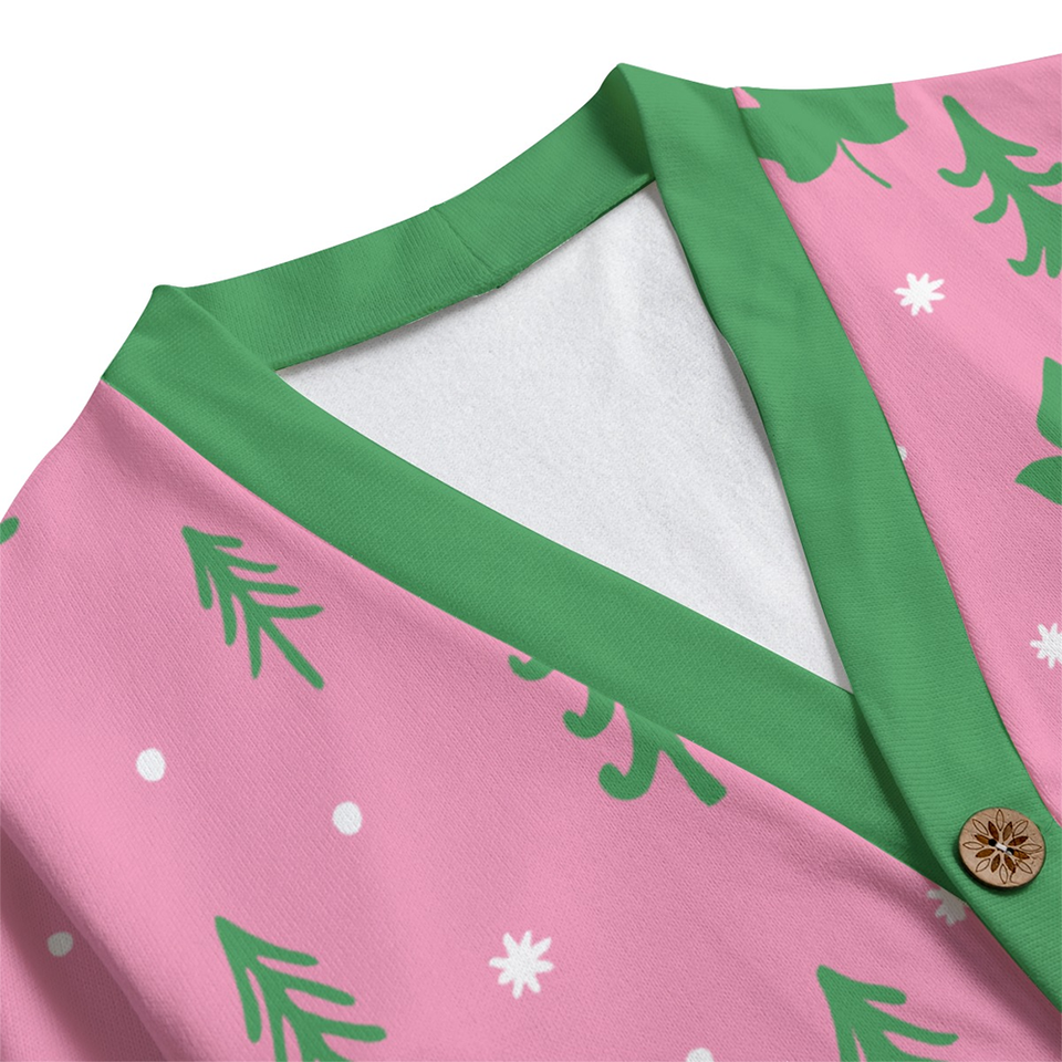 เสื้อคาร์ดิแกนไหมพรมคอวีสีชมพูและสีเขียวสำหรับฤดูหนาว ผ้าฟลีซ Hacci ลายต้นไม้และไอวี่ โลโก้ด้านหน้าแบบถัก ได้รับแรงบันดาลใจจากสมาคมนักศึกษาหญิง